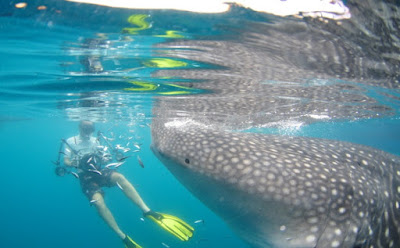 Saat melihat hiu paus berenang dekat permukaan, saya rasanya langsung tak sabar untuk menceburkan diri ke laut, lengkap dengan kaki katak dan masker untuk snorkeling. Begitu menjengukkan wajah saya ke bawah permukaan laut, saya begitu terkesima: dua ekor hiu paus berenang tepat di depan wajah saya! Wow! Sesekali, saya menahan napas dan menyelam untuk mengikuti mereka dari belakang. Saya juga harus tetap waspada dan siap menghindar agar tak sampai tertabrak! Saat free diving seperti ini, saya tak bisa mendengar suara apapun. Sekeliling saya begitu hening, membuat saya begitu rileks!