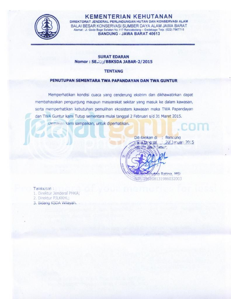 Kawasan Taman Wisata Alam Gunung Papandayan dan Taman Wisata Alam Gunung Guntur resmi ditutup. berikut adalah isi surat tentang penutupannya