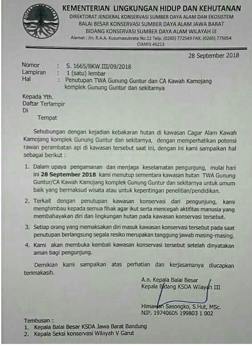 Penutupan pendakian ini, ditetapkan lewat surat yang dikeluarkan Bidang Konservasi Sumber Daya Alam wilayah III Ciamis nomor S.1665/BKW.III/09/2018. Surat tersebut ditandatangani Kepala BKSDA Wilayah III Ciamis, Himawan Sasongko.