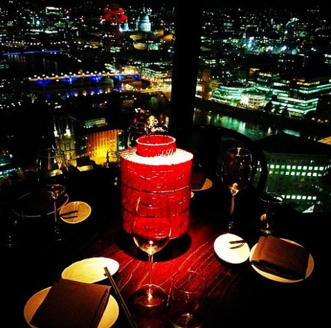 Lift dengan cepat membawa kami ke atas, membuka pintu di jajaran restoran yang dikelilingi dinding kaca. Saya sempat lupa bernapas beberapa detik, terhipnotis kerlap-kerlip London yang memabukkan.