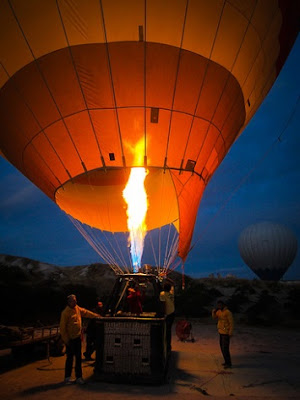 Kami berkendara selama kurang lebih 10 menit sebelum tiba di sebuah padang tandus dengan rumah-rumah merpati dan gua-gua kecil khas Cappadocia. Para petugas mulai bersiap menyiapkan balon udara panas. Deru suara gas memekakkan telinga, berbaur dengan kilatan api besar yang mulai mengisi udara panas ke balon.