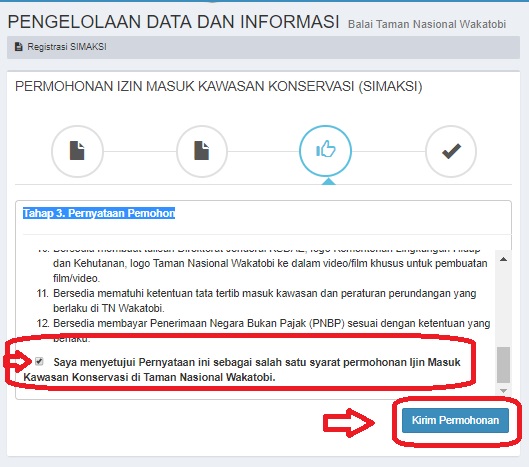 Pada tahap ini Anda kan membaca pernyataan, berikut beberpa pertanyaan yang harus Anda setujui untuk melanjutkan simaksi pendaftaraan online Taman Nasional Wakatobi.